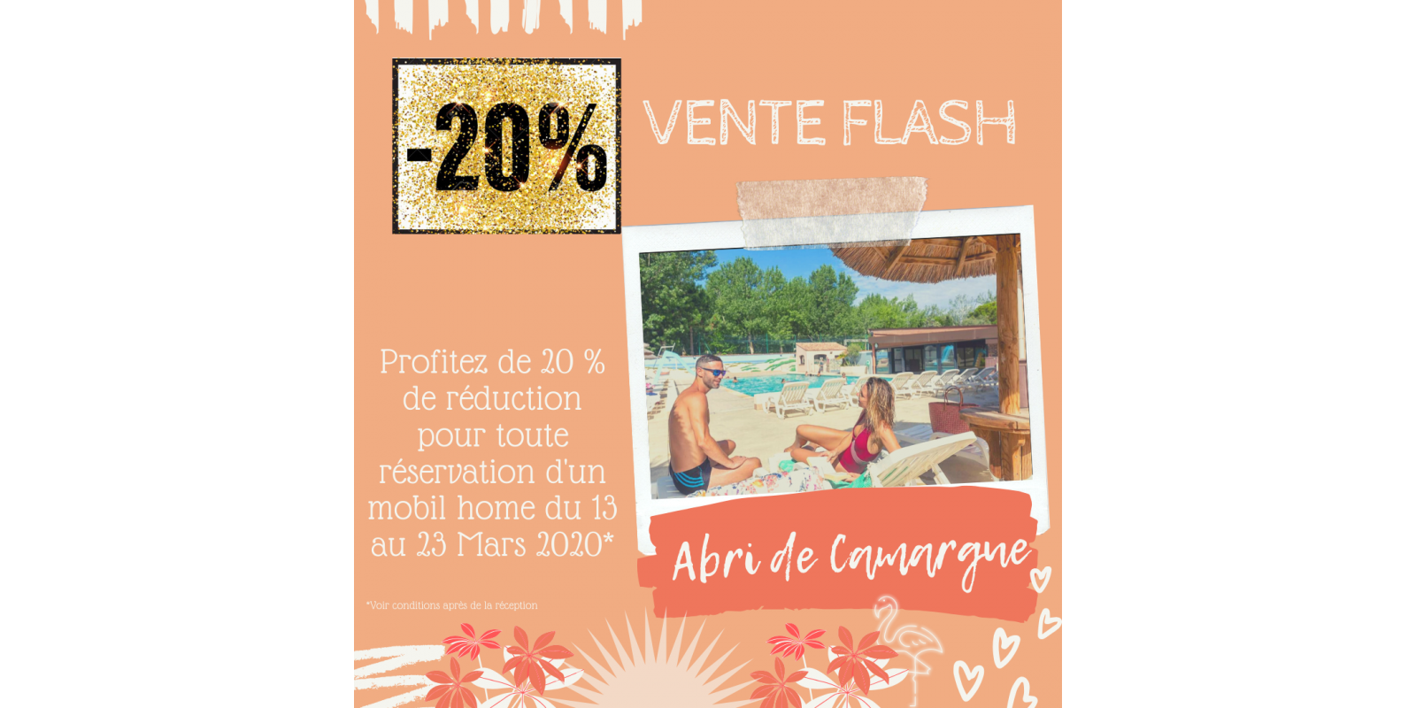 Pour profiter encore plus de votre séjour et fêter l'ouverture de la saison 2020, le camping Abri de Camargue vous offre 20 % de remise sur votre location.